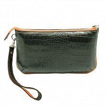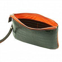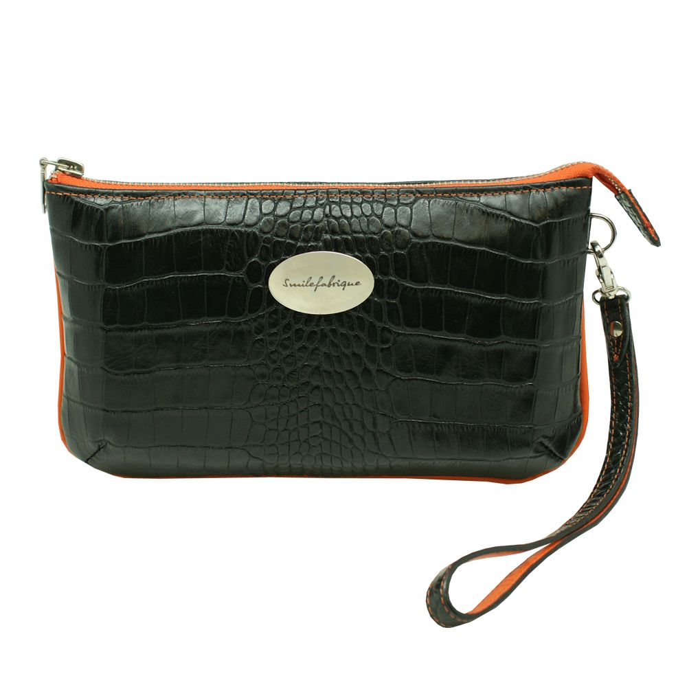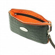 Сумка-клатч из черной натуральной кожи "Кроко" с контрастными оранжевыми боковыми вставками и подкладкой...Создавая эту удачную серию женских маленьких сумочек "Темпо" мы думали о быстротечности времени...О, темпо, о - время...Ритм жизни постоянно ускоряется и мы, зачастую, не этого замечаем. Остановись, мгновение! Спеша по делам, не забудьте Ваш клатч в прихожей, ведь миниатюрный клатч обязательно есть в арсенале любой женщины. Внутреннее отделение оснащено карманом на молнии и небольшими кармашками для пластиковых карт. Ремешок на руку пристегивается декоративным карабином. Замечательный стильный клатч.